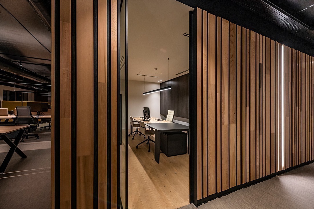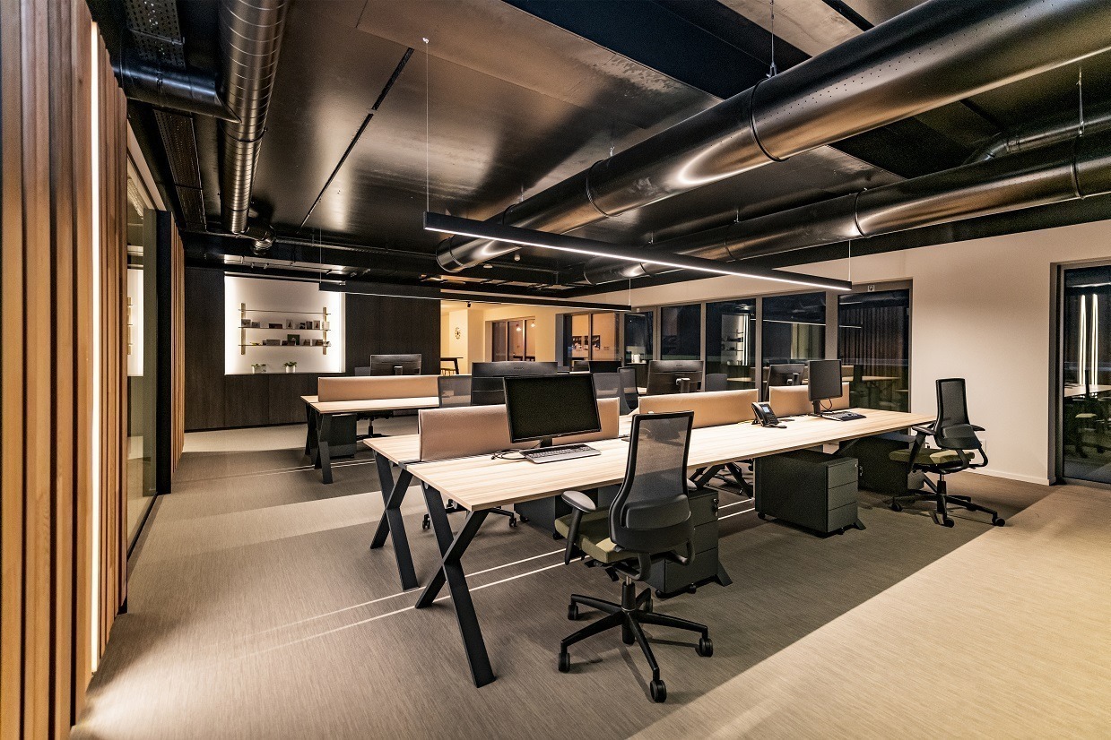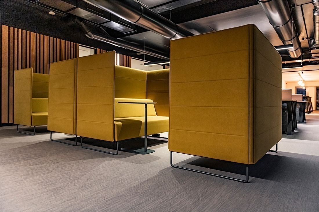 Als Arbeitsplätze wurde der Bankarbeitsplatz Big X gewählt. Das robuste X-Bein dieser Bank verleiht dem Büro sofort einen industriellen und luxuriösen Look. Im selben Raum wie die Bänke wurden vier Akustikbänke aufgestellt. Das Akustiksofa Tris ermöglicht durch die hohen Rücken- und Seitenwände dieses Sofas die Durchführung von Besprechungen ohne Lärmbelästigung.