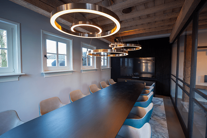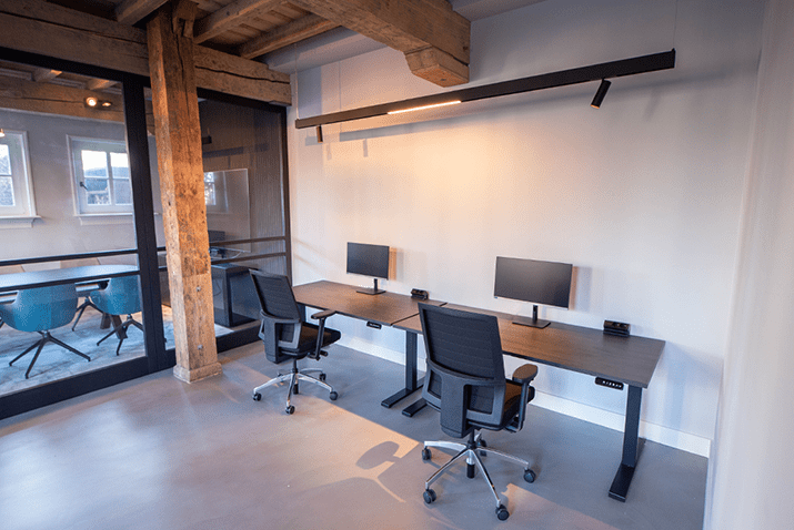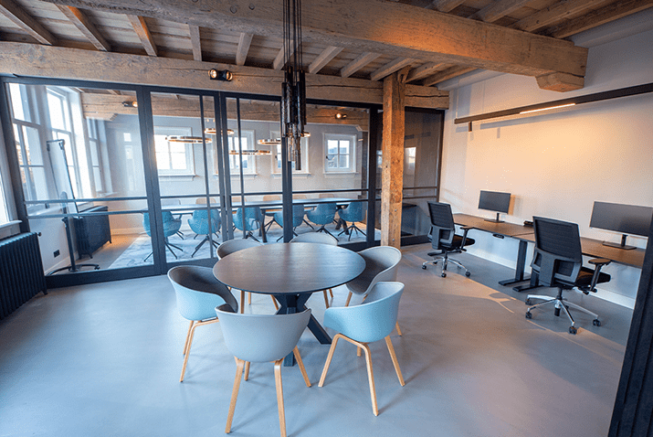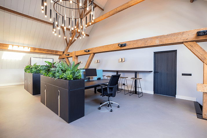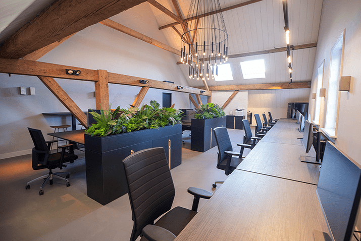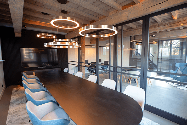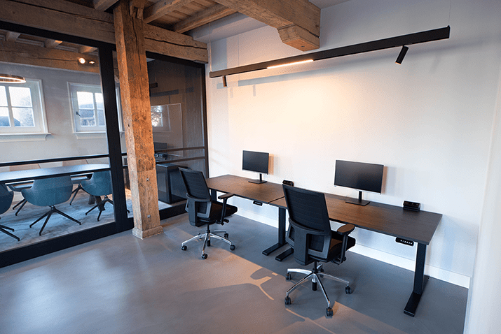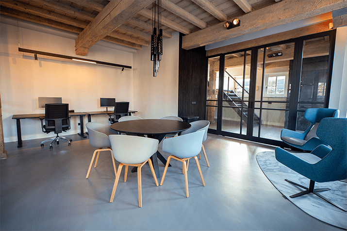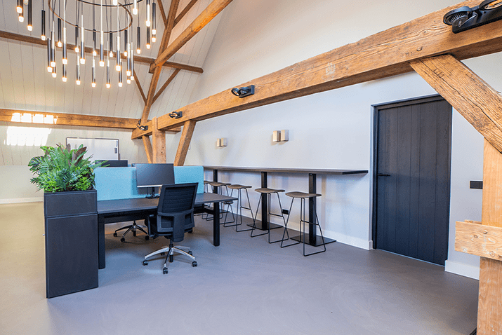 Was erhält man, wenn man ein altes Bauernhaus in ein Bürogebäude verwandelt? Ein einzigartiges Aussehen mit einem optimalen Gleichgewicht zwischen der authentischen Atmosphäre und der modernen Einrichtung. Die Eichenbalken, die das Gebäude prägen, gehen nahtlos in den modernen Look der Büromöbel über.
