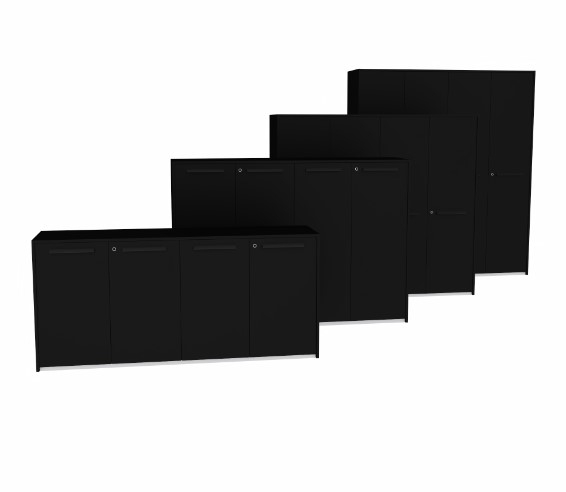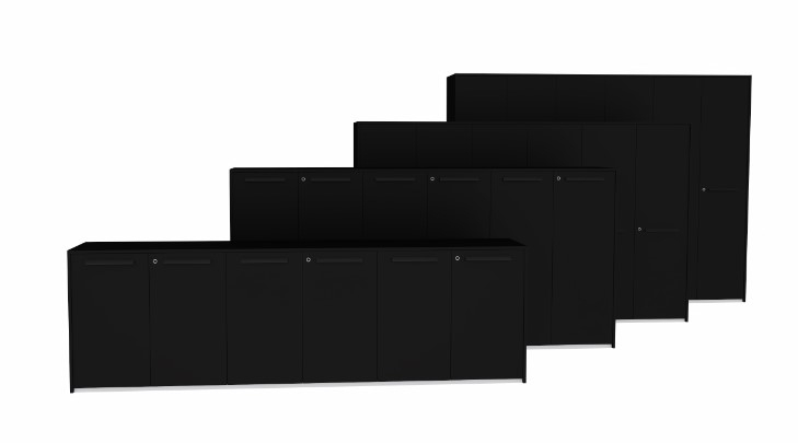 Die Uni-Flügeltürenschränke können ganz nach Ihren Wünschen zusammengestellt werden. Die Uni-Flügelltürenschränke sind auch in einer 2-, 4- und 6-türigen Version erhältlich. Der Uni-Flügeltürenschränke ist in den Höhen 85, 130 und 210 cm erhältlich. Die Türen, Oberteile und Seitenverkleidungen dieser Version sind komplett in Mattschwarz gehalten. Bei den Griffen haben Sie die Wahl zwischen drei verschiedenen Formen. Die Griffe des mattschwarzen Uni-Schranks sind anthrazitfarben.